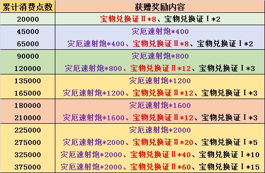 活动期间,累计消费满20000点的玩家,即可获得官方赠送的“宝物兑换证Ⅱ”和额外赠送的“宝物兑换证Ⅰ”;累计消费达到45000点,即可获赠400门“灾厄速射炮”;累计消费点数越多即可解锁更多精美奖励!