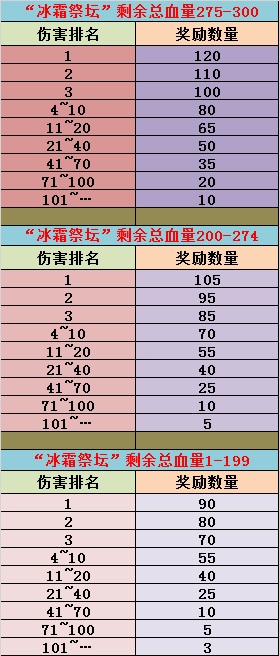 若玩家在活动结束前,保持任意一座祭坛存活,则抵御成功,活动结束时根据3座“冰霜祭坛”剩余血量总和及玩家伤害输出排名,发放奖励至仓库管理员领奖列表,奖励结算规则如下: