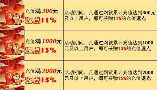 玉堂金马,步步登高!新春佳节,充值即享惊喜大返点。活动期间,凡通过网银充值满指定金额的用户,最高可享15%的中心返点!