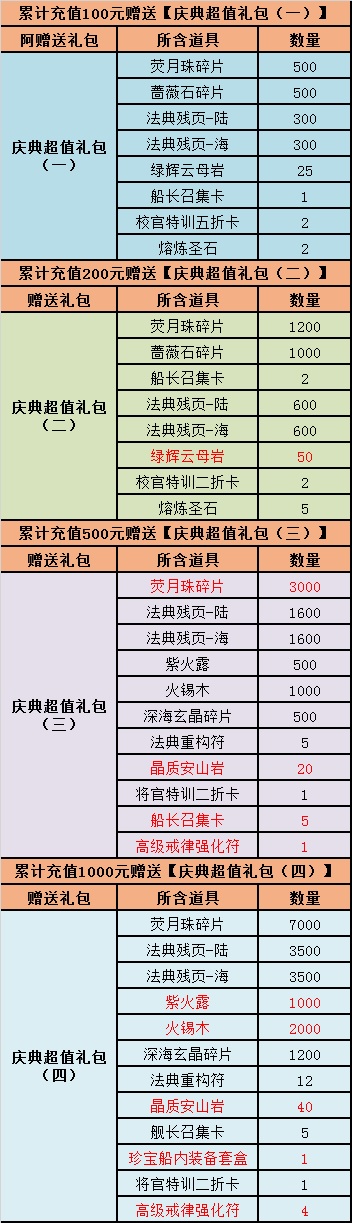 活动期间玩家如果通过网银充值,新【庆典超值礼包】送不停。荧月珠碎片、晶质安山岩、将官特训二折卡,校官特训二折卡等超值好礼拿不停,你还在等什么!